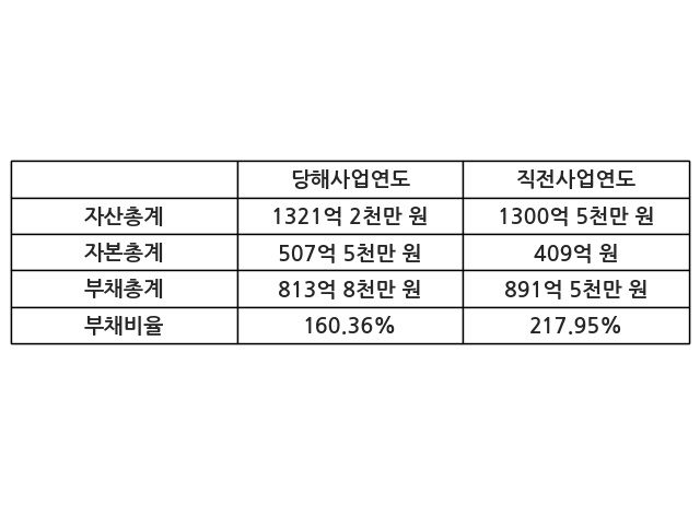 또한, 이번사업연도의 자산총계는 1321억 2천만 원으로 직전사업연도 대비 1.6% 증가한 한편, 부채총계는 813억 8천만 원으로 -8.71% 감소, 자본총계는 507억 5천만 원으로 24.07% 증가했다.