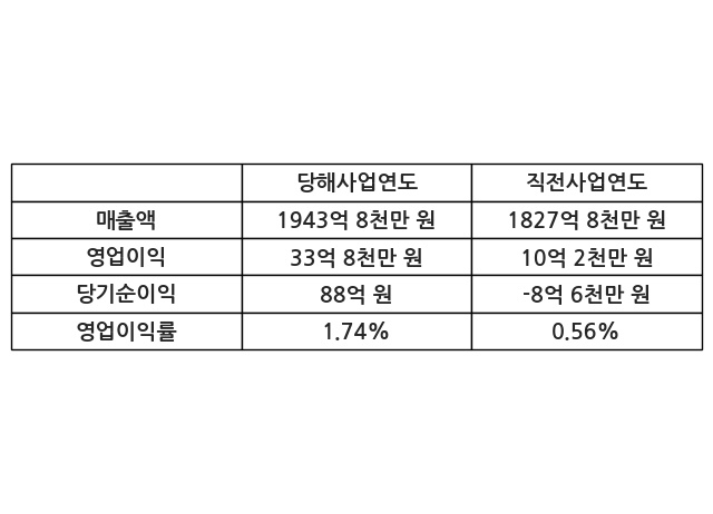 이번사업연도의 매출액은 직전사업연도 대비 6.34% 증가한 1943억 8천만 원, 영업이익은 33억 8천만 원, 당기순이익은 88억 원이라고 공시했다.