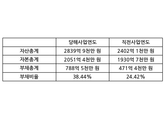 또한, 이번사업연도의 자산총계는 2839억 9천만 원으로 직전사업연도 대비 18.23% 증가한 한편, 부채총계는 788억 5천만 원으로 67.28% 증가, 자본총계는 2051억 4천만 원으로 6.25% 증가했다.