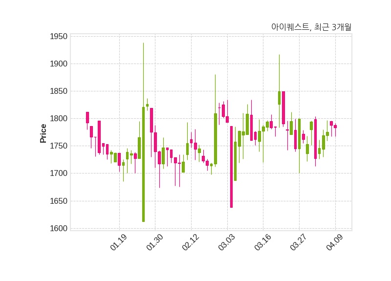 한편, 아이퀘스트는 장 마감 이후 해당 기업공시를 발표했으며 오늘 종가가 1,783원, 거래량은 35,106주로, 직전 거래일 대비 5원(-0.28%) 하락했다.