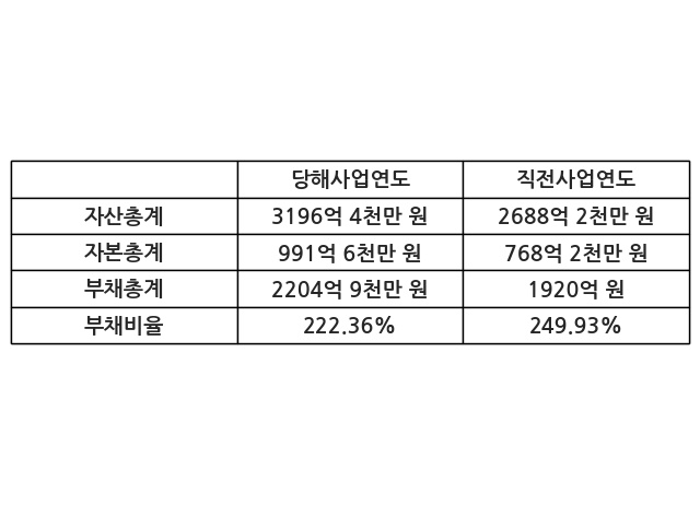 또한, 이번사업연도의 자산총계는 3196억 4천만 원으로 직전사업연도 대비 18.91% 증가한 한편, 부채총계는 2204억 9천만 원으로 14.84% 증가, 자본총계는 991억 6천만 원으로 29.08% 증가했다.