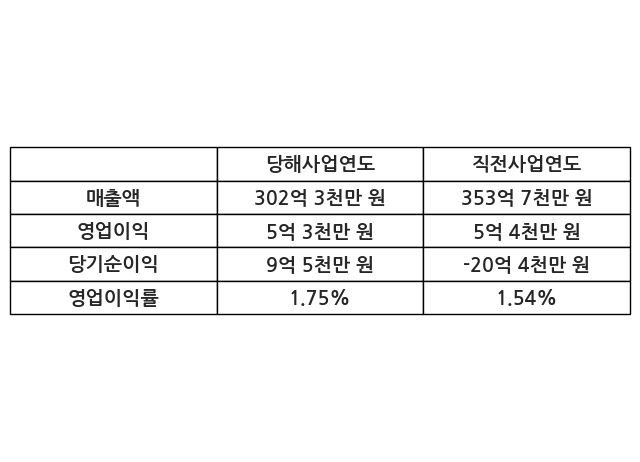 이번사업연도의 매출액은 직전사업연도 대비 -14.52% 감소한 302억 3천만 원, 영업이익은 5억 3천만 원, 당기순이익은 9억 5천만 원이라고 공시했다.