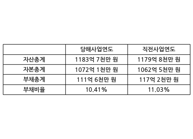또한, 이번사업연도의 자산총계는 1183억 7천만 원으로 직전사업연도 대비 0.34% 증가한 한편, 부채총계는 111억 6천만 원으로 -4.81% 감소, 자본총계는 1072억 1천만 원으로 0.9% 증가했다.