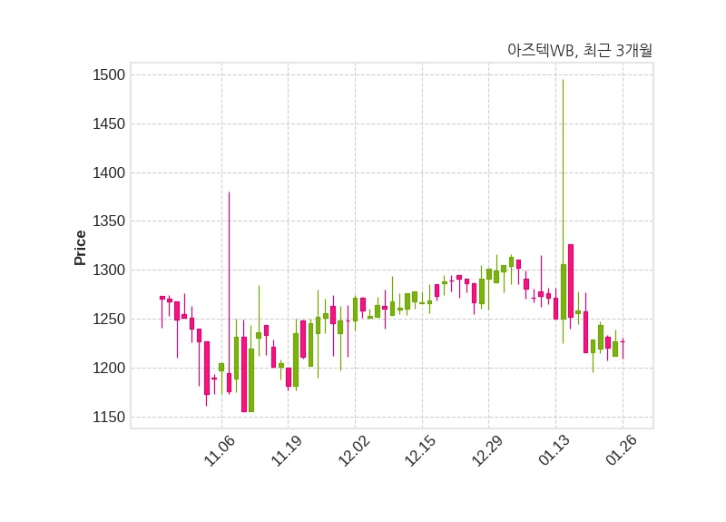 한편, 아즈텍WB은 장 마감 이후 해당 기업공시를 발표했으며 오늘 종가가 1,227원, 거래량은 37,183주로, 직전 거래일 대비 변동이없다.