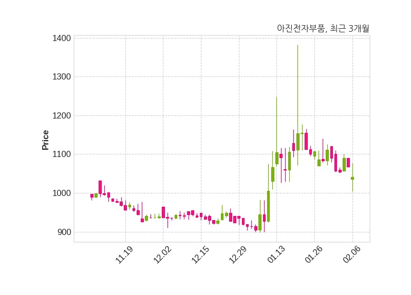 한편, 아진전자부품의 11시 45분 현재주가는 1,041원으로 직전 거래일 대비 27원(-2.53%) 하락이며, 거래량은 255,195주이다.