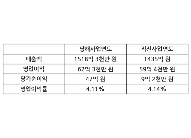 이번사업연도의 매출액은 직전사업연도 대비 5.81% 증가한 1518억 3천만 원, 영업이익은 62억 3천만 원, 당기순이익은 47억 원이라고 공시했다.