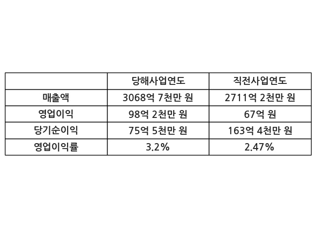 이번사업연도의 매출액은 직전사업연도 대비 13.19% 증가한 3068억 7천만 원, 영업이익은 98억 2천만 원, 당기순이익은 75억 5천만 원이라고 공시했다.