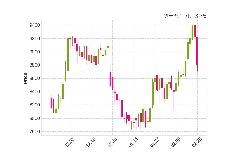 한편, 안국약품은 장 마감 이후 해당 기업공시를 발표했으며 오늘 종가가 8,800원, 거래량은 196,360주로, 직전 거래일 대비 420원(-4.56%) 하락했다.
