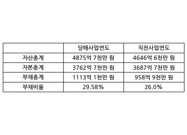또한, 이번사업연도의 자산총계는 4875억 7천만 원으로 직전사업연도 대비 4.93% 증가한 한편, 부채총계는 1113억 1천만 원으로 16.07% 증가, 자본총계는 3762억 7천만 원으로 2.03% 증가했다.