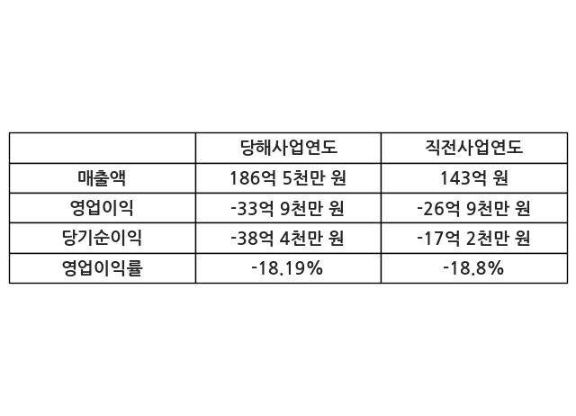 이번사업연도의 매출액은 직전사업연도 대비 30.4% 증가한 186억 5천만 원, 영업이익은 -33억 9천만 원, 당기순이익은 -38억 4천만 원이라고 공시했다.