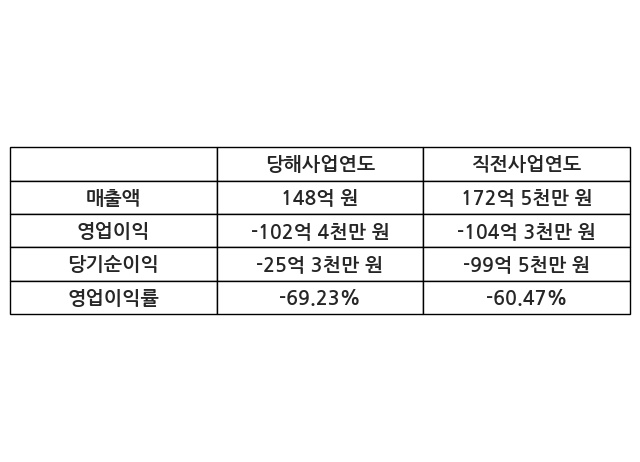 이번사업연도의 매출액은 직전사업연도 대비 -14.23% 감소한 148억 원, 영업이익은 -102억 4천만 원, 당기순이익은 -25억 3천만 원이라고 공시했다.