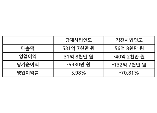 이번사업연도의 매출액은 직전사업연도 대비 835.91% 증가한 531억 7천만 원, 영업이익은 31억 8천만 원, 당기순이익은 -5930만 원이라고 공시했다.