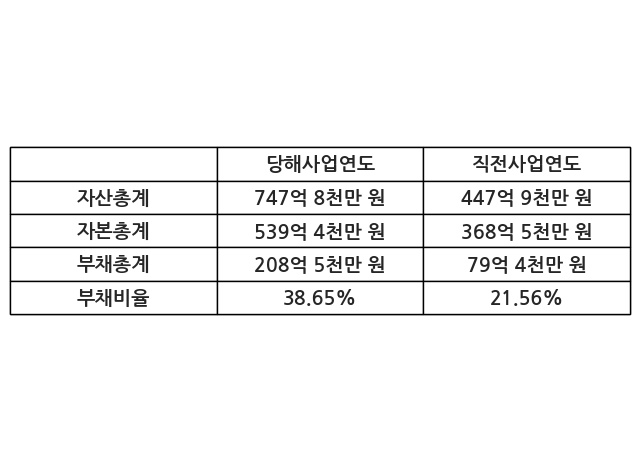 또한, 이번사업연도의 자산총계는 747억 8천만 원으로 직전사업연도 대비 66.95% 증가한 한편, 부채총계는 208억 5천만 원으로 162.41% 증가, 자본총계는 539억 4천만 원으로 46.37% 증가했다.