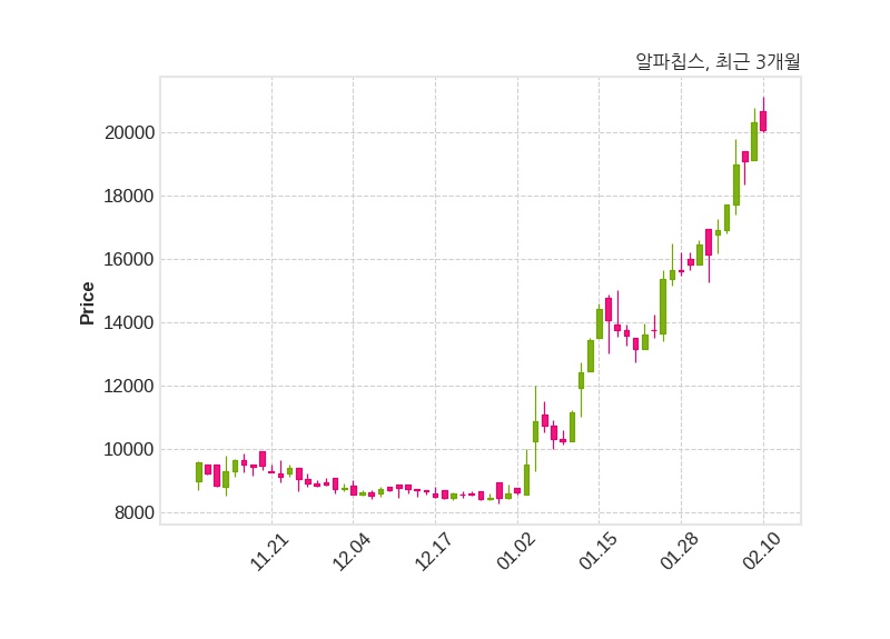 한편, 알파칩스의 14시 58분 현재주가는 20,050원으로 직전 거래일 대비 250원(-1.23%) 하락이며, 거래량은 50,626주이다.