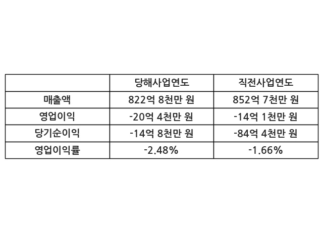 이번사업연도의 매출액은 직전사업연도 대비 -3.51% 감소한 822억 8천만 원, 영업이익은 -20억 4천만 원, 당기순이익은 -14억 8천만 원이라고 공시했다.
