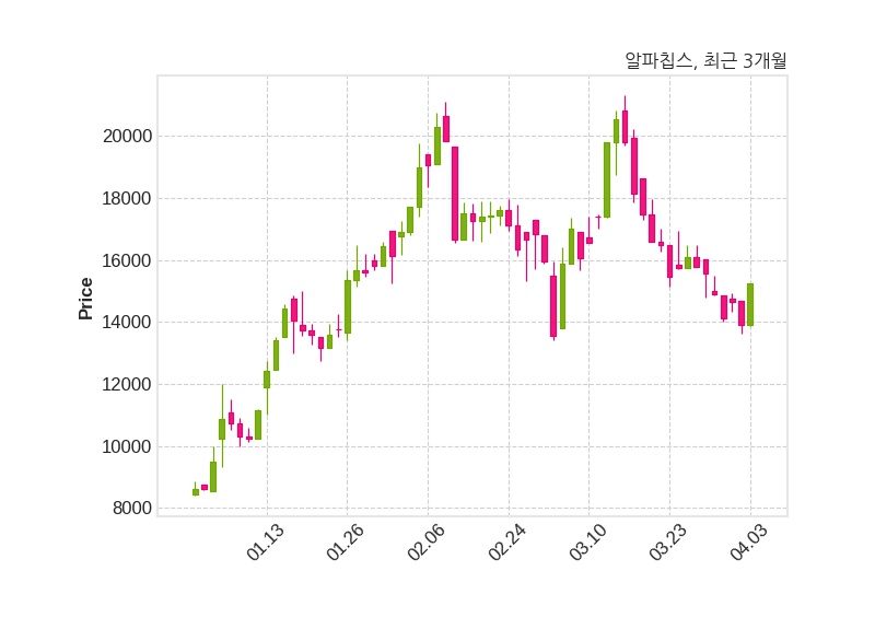 한편, 알파칩스의 14시 44분 현재주가는 15,250원으로 직전 거래일 대비 1,340원(+9.63%) 상승이며, 거래량은 13,271주이다.
