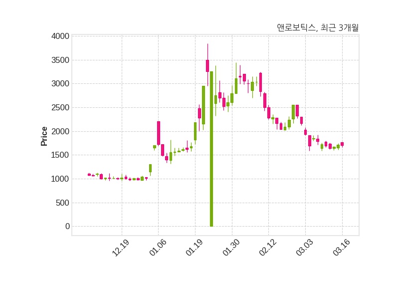 한편, 앤로보틱스는 장 마감 이후 해당 기업공시를 발표했으며 오늘 종가가 1,703원, 거래량은 412,038주로, 직전 거래일 대비 11원(-0.64%) 하락했다.