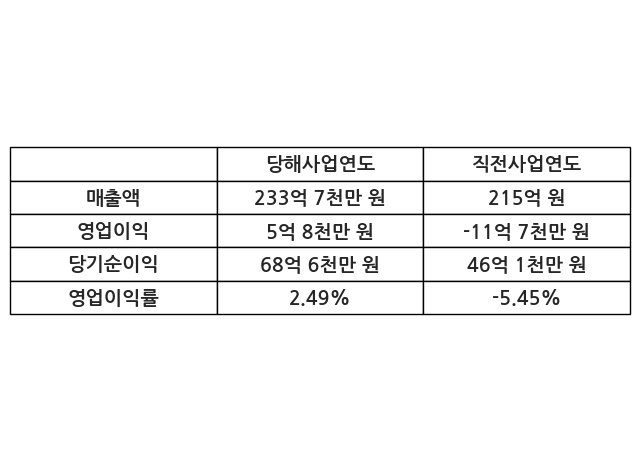 이번사업연도의 매출액은 직전사업연도 대비 8.69% 증가한 233억 7천만 원, 영업이익은 5억 8천만 원, 당기순이익은 68억 6천만 원이라고 공시했다.