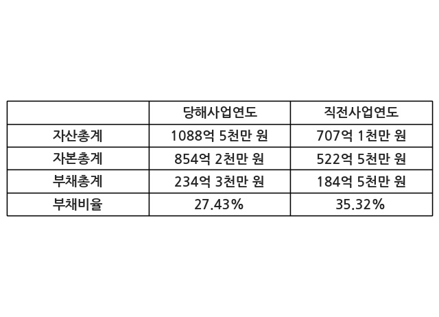 또한, 이번사업연도의 자산총계는 1088억 5천만 원으로 직전사업연도 대비 53.94% 증가한 한편, 부채총계는 234억 3천만 원으로 26.98% 증가, 자본총계는 854억 2천만 원으로 63.46% 증가했다.