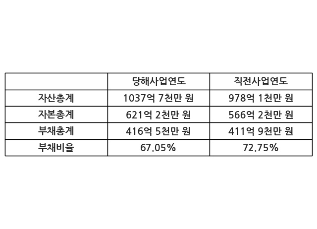 또한, 이번사업연도의 자산총계는 1037억 7천만 원으로 직전사업연도 대비 6.09% 증가한 한편, 부채총계는 416억 5천만 원으로 1.12% 증가, 자본총계는 621억 2천만 원으로 9.71% 증가했다.