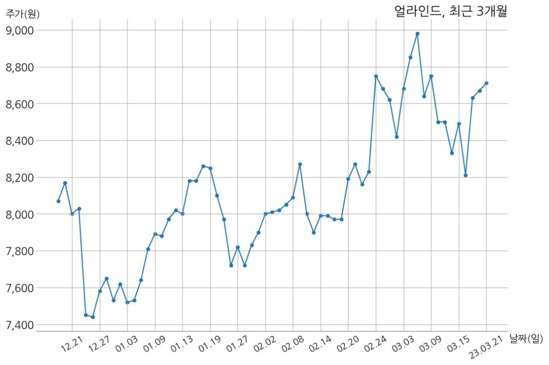 한편, 얼라인드의 15시 28분 현재주가는 8,280원으로 직전 거래일 대비 370원(-4.28%) 하락이며, 거래량은 20,027주이다.