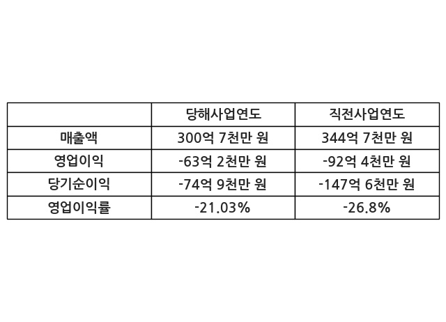이번사업연도의 매출액은 직전사업연도 대비 -12.77% 감소한 300억 7천만 원, 영업이익은 -63억 2천만 원, 당기순이익은 -74억 9천만 원이라고 공시했다.
