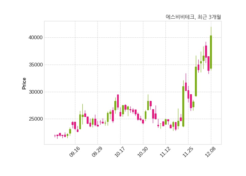 한편, 에스비비테크의 13시 56분 현재주가는 40,350원으로 직전 거래일 대비 6,450원(+19.03%) 상승이며, 거래량은 1,407,708주이다.