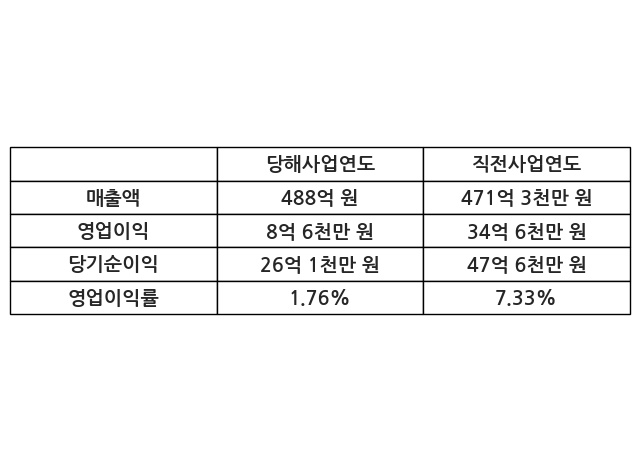 이번사업연도의 매출액은 직전사업연도 대비 3.55% 증가한 488억 원, 영업이익은 8억 6천만 원, 당기순이익은 26억 1천만 원이라고 공시했다.