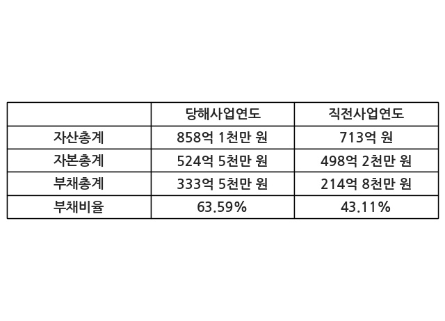 또한, 이번사업연도의 자산총계는 858억 1천만 원으로 직전사업연도 대비 20.35% 증가한 한편, 부채총계는 333억 5천만 원으로 55.31% 증가, 자본총계는 524억 5천만 원으로 5.28% 증가했다.