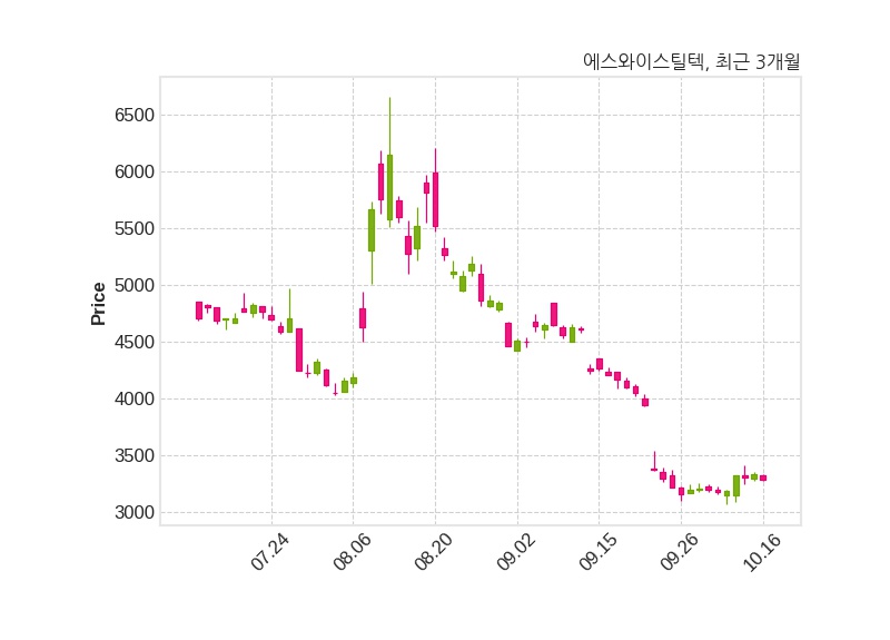 한편, 에스와이스틸텍은 장 마감 이후 해당 기업공시를 발표했으며 오늘 종가가 3,285원, 거래량은 742,959주로, 직전 거래일 대비 50원(-1.5%) 하락했다.