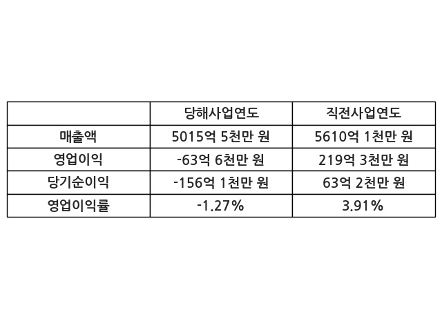 이번사업연도의 매출액은 직전사업연도 대비 -10.6% 감소한 5015억 5천만 원, 영업이익은 -63억 6천만 원, 당기순이익은 -156억 1천만 원이라고 공시했다.