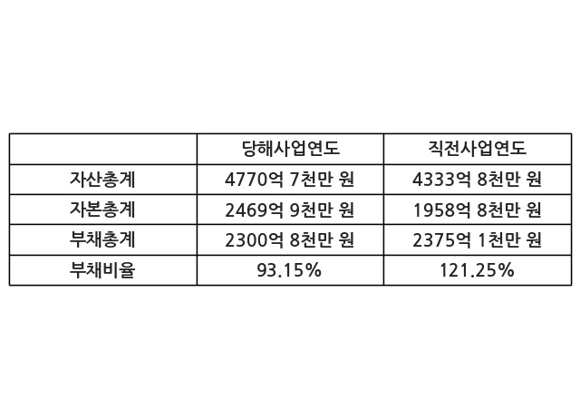 또한, 이번사업연도의 자산총계는 4770억 7천만 원으로 직전사업연도 대비 10.08% 증가한 한편, 부채총계는 2300억 8천만 원으로 -3.13% 감소, 자본총계는 2469억 9천만 원으로 26.1% 증가했다.