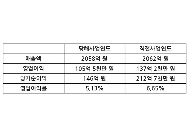 이번사업연도의 매출액은 직전사업연도 대비 -0.19% 감소한 2058억 원, 영업이익은 105억 5천만 원, 당기순이익은 146억 원이라고 공시했다.