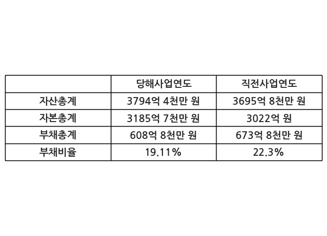 또한, 이번사업연도의 자산총계는 3794억 4천만 원으로 직전사업연도 대비 2.67% 증가한 한편, 부채총계는 608억 8천만 원으로 -9.64% 감소, 자본총계는 3185억 7천만 원으로 5.42% 증가했다.
