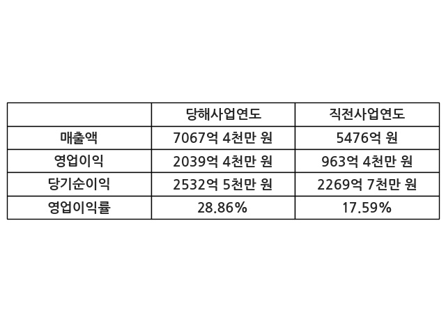 이번사업연도의 매출액은 직전사업연도 대비 29.06% 증가한 7067억 4천만 원, 영업이익은 2039억 4천만 원, 당기순이익은 2532억 5천만 원이라고 공시했다.