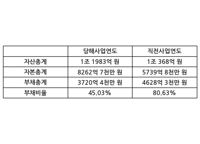 또한, 이번사업연도의 자산총계는 1조 1983억 원으로 직전사업연도 대비 15.58% 증가한 한편, 부채총계는 3720억 4천만 원으로 -19.62% 감소, 자본총계는 8262억 7천만 원으로 43.95% 증가했다.
