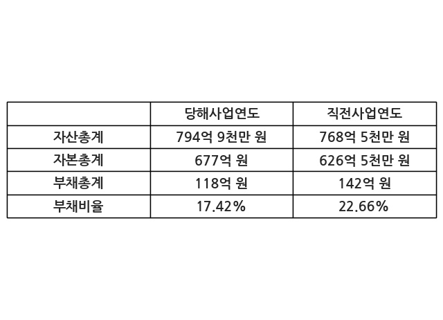 또한, 이번사업연도의 자산총계는 794억 9천만 원으로 직전사업연도 대비 3.44% 증가한 한편, 부채총계는 118억 원으로 -16.91% 감소, 자본총계는 677억 원으로 8.05% 증가했다.