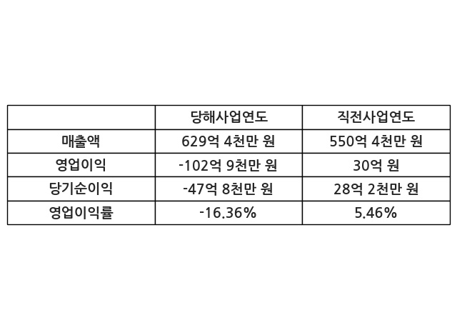 이번사업연도의 매출액은 직전사업연도 대비 14.35% 증가한 629억 4천만 원, 영업이익은 -102억 9천만 원, 당기순이익은 -47억 8천만 원이라고 공시했다.