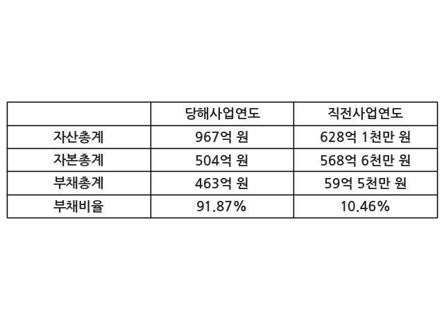 또한, 이번사업연도의 자산총계는 967억 원으로 직전사업연도 대비 53.96% 증가한 한편, 부채총계는 463억 원으로 678.75% 증가, 자본총계는 504억 원으로 -11.37% 감소했다.