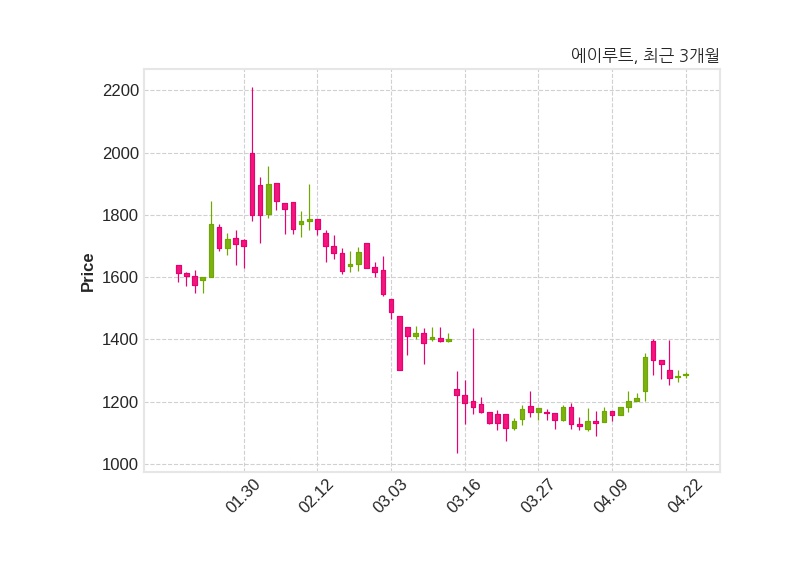 한편, 에이루트는 장 마감 이후 해당 기업공시를 발표했으며 오늘 종가가 1,288원, 거래량은 36,876주로, 직전 거래일 대비 7원(+0.55%) 상승했다.