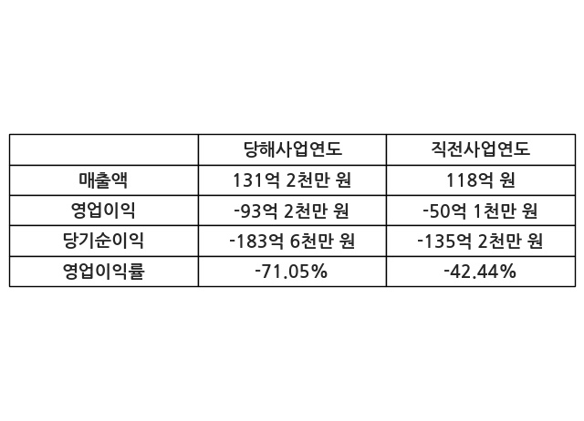 이번사업연도의 매출액은 직전사업연도 대비 11.23% 증가한 131억 2천만 원, 영업이익은 -93억 2천만 원, 당기순이익은 -183억 6천만 원이라고 공시했다.