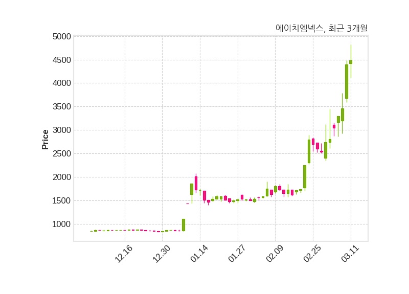 한편, 에이치엠넥스의 13시 25분 현재주가는 4,480원으로 직전 거래일 대비 80원(+1.82%) 상승이며, 거래량은 3,399,195주이다.