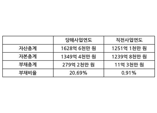또한, 이번사업연도의 자산총계는 1628억 6천만 원으로 직전사업연도 대비 30.17% 증가한 한편, 부채총계는 279억 2천만 원으로 2365.27% 증가, 자본총계는 1349억 4천만 원으로 8.84% 증가했다.