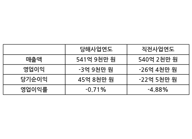 이번사업연도의 매출액은 직전사업연도 대비 0.32% 증가한 541억 9천만 원, 영업이익은 -3억 9천만 원, 당기순이익은 45억 8천만 원이라고 공시했다.