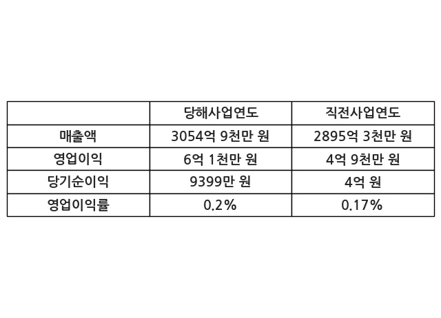 이번사업연도의 매출액은 직전사업연도 대비 5.51% 증가한 3054억 9천만 원, 영업이익은 6억 1천만 원, 당기순이익은 9399만 원이라고 공시했다.