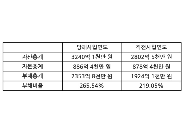 또한, 이번사업연도의 자산총계는 3240억 1천만 원으로 직전사업연도 대비 15.62% 증가한 한편, 부채총계는 2353억 8천만 원으로 22.33% 증가, 자본총계는 886억 4천만 원으로 0.91% 증가했다.