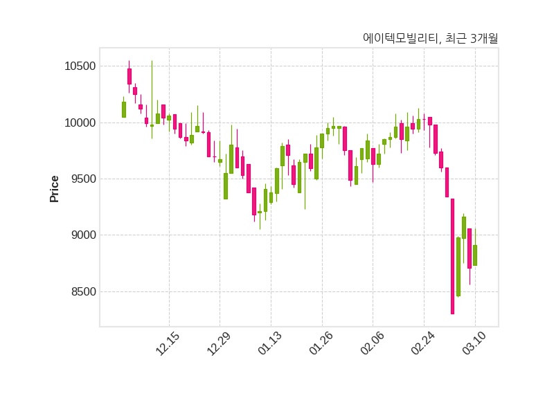 한편, 에이텍모빌리티는 장 마감 이후 해당 기업공시를 발표했으며 오늘 종가가 8,910원, 거래량은 21,073주로, 직전 거래일 대비 200원(+2.3%) 상승했다.