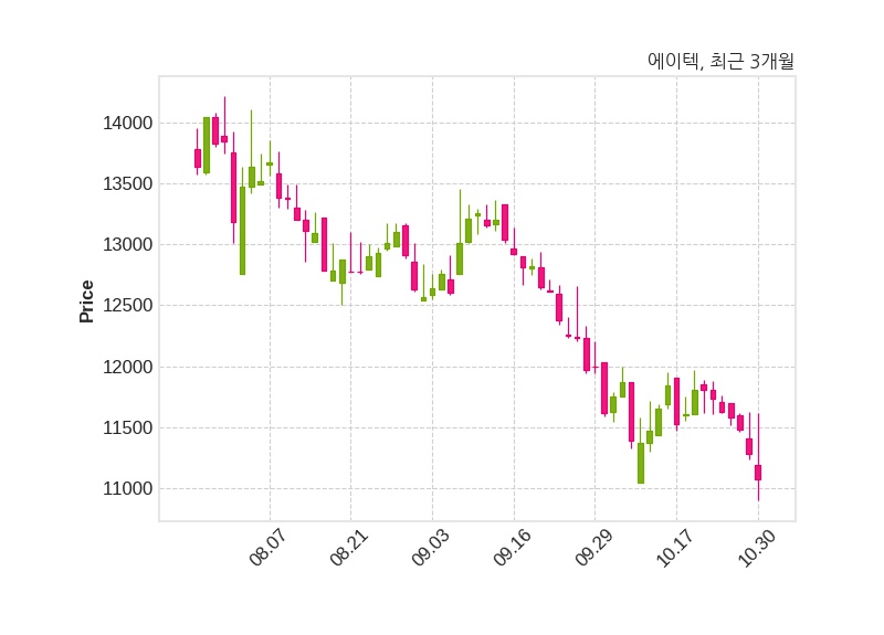 한편, 에이텍은 장 마감 이후 해당 기업공시를 발표했으며 오늘 종가가 11,070원, 거래량은 60,425주로, 직전 거래일 대비 210원(-1.86%) 하락했다.