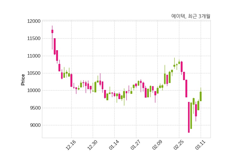 한편, 에이텍은 장 마감 이후 해당 기업공시를 발표했으며 오늘 종가가 9,960원, 거래량은 68,107주로, 직전 거래일 대비 270원(+2.79%) 상승했다.