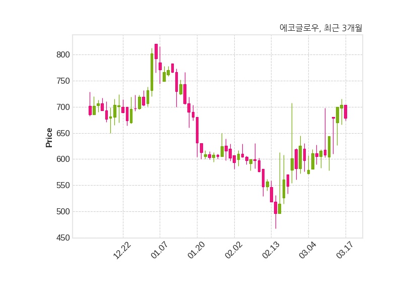 한편, 에코글로우는 장 마감 이후 해당 기업공시를 발표했으며 오늘 종가가 678원, 거래량은 122,067주로, 직전 거래일 대비 26원(-3.69%) 하락했다.